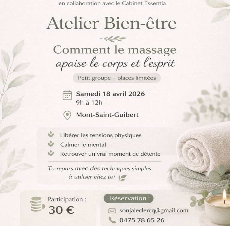 Atelier découverte - comment le massage apaise le corps et l'esprit - samedi 18 avril 2026 sur inscription